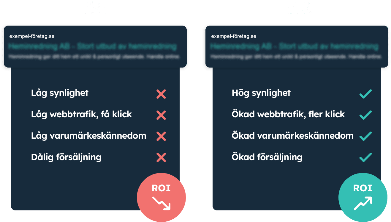 En dåligt SEO-optimerad hemsida leder till sämre rankning, låg synlighet och färre möjligheter att nå ut till potentiella kunder. Därför behöver du en SEO-byrå som hanterar din sökmotoroptimering på rätt sätt så att din synlighet ökar och ditt företag växer.